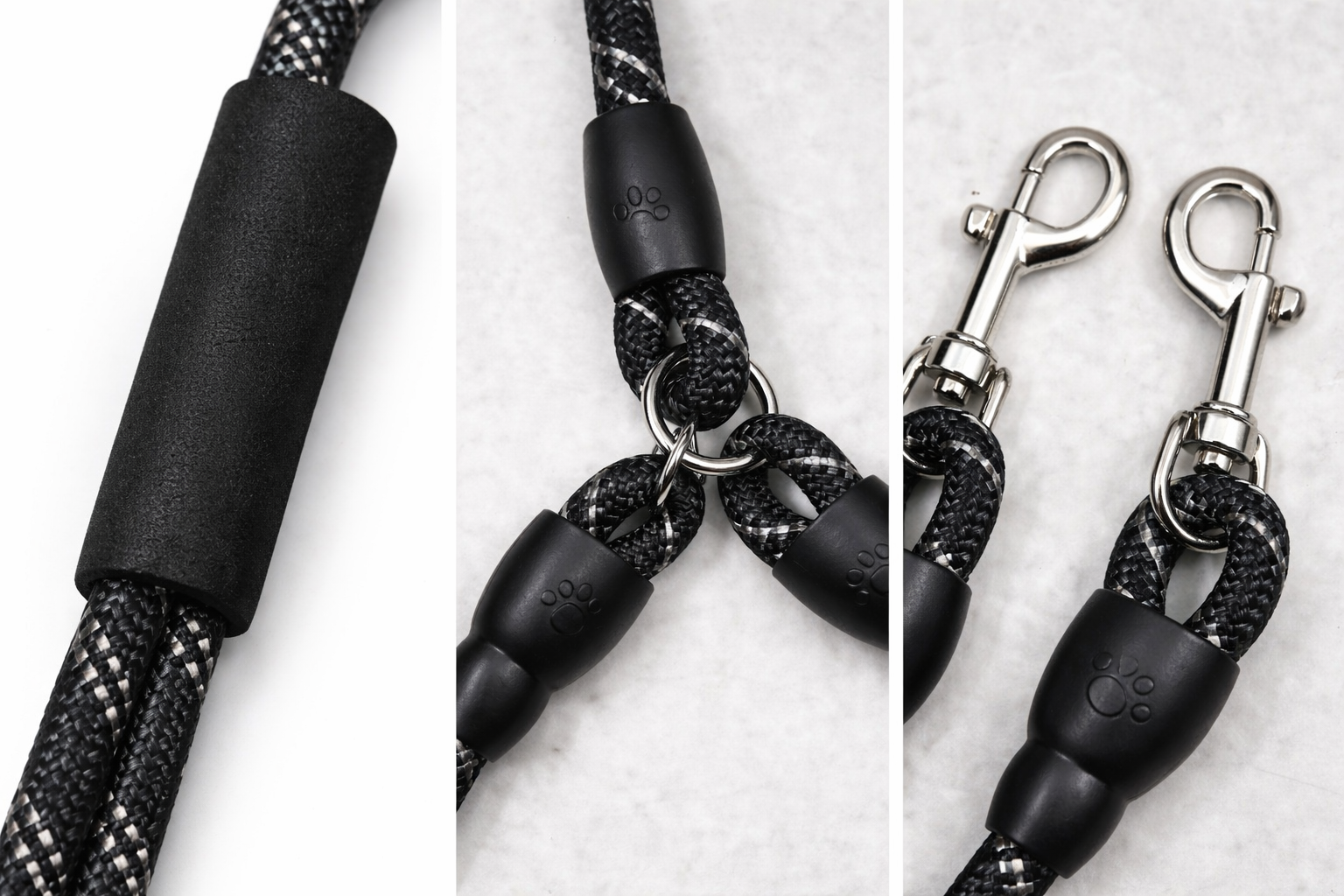 Crafted from premium braided climbing-grade rope, Clawmego’s Dual Leash offers exceptional durability without compromising comfort. The strong metal swivel hooks rotate smoothly to reduce twisting and pulling, giving both pets freedom to move naturally. The soft foam handle ensures a secure, non-slip grip — protecting your hands during long walks.